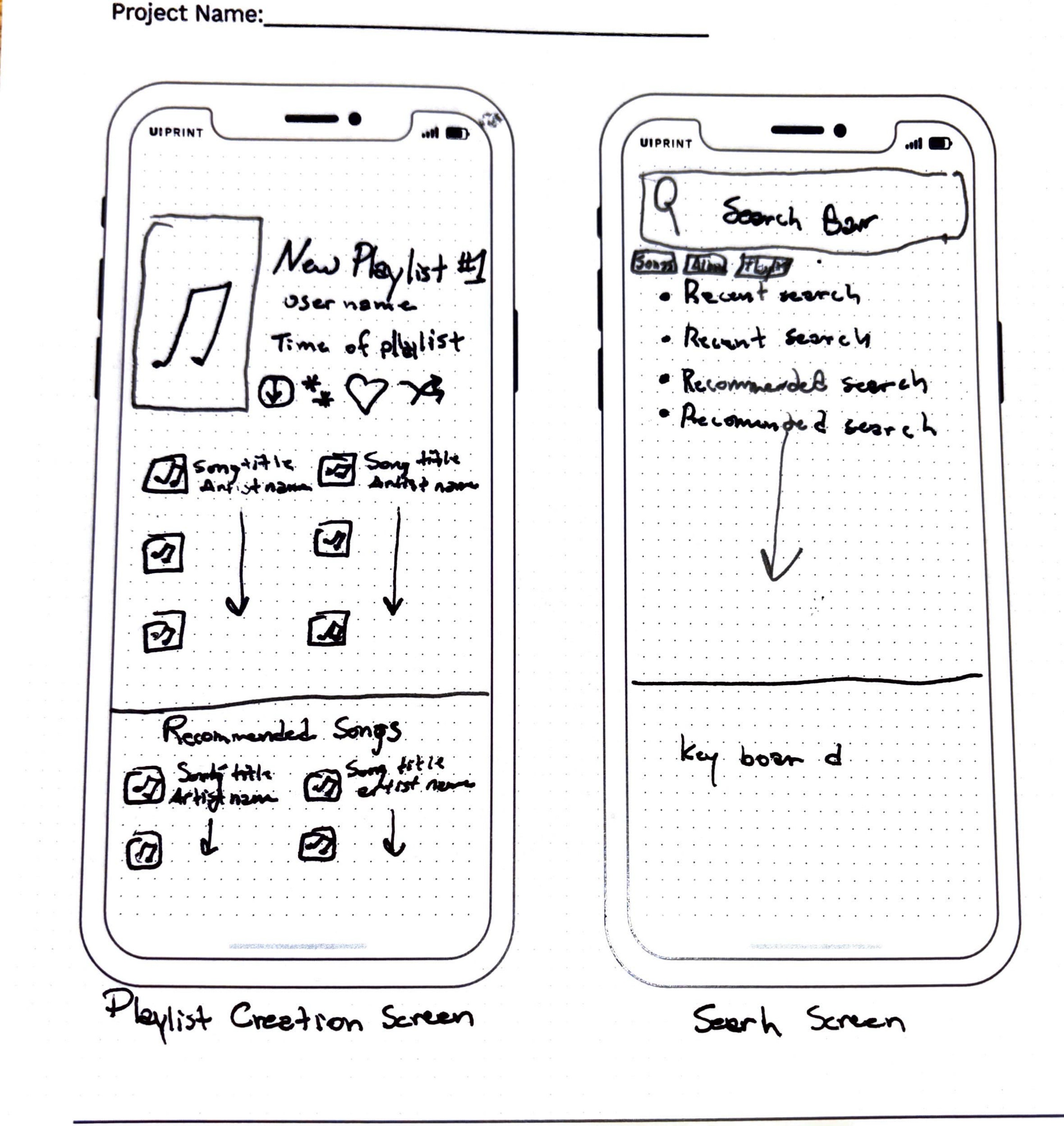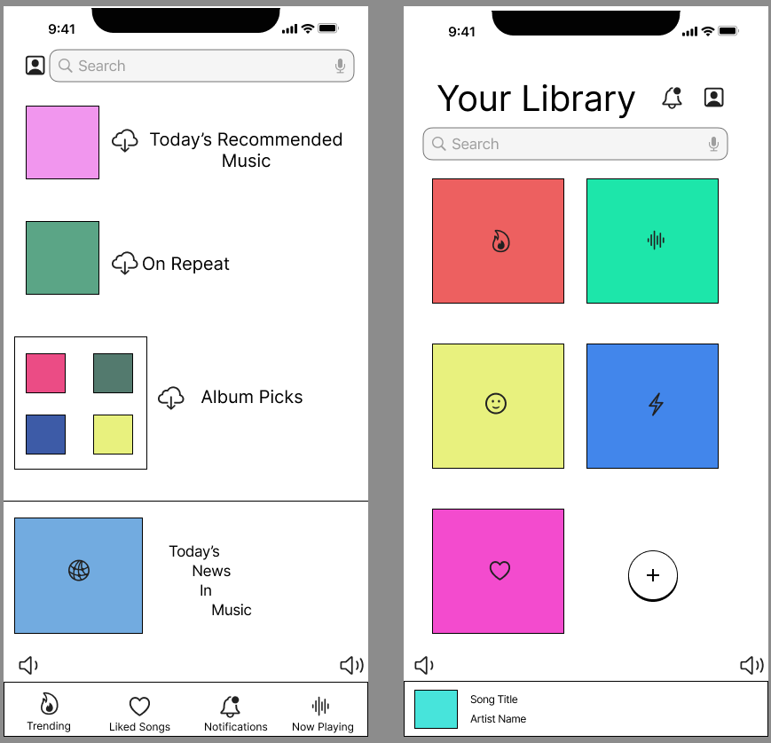 When going through my wireframe sketches, noticed I wasn’t satisfied with the way I created the playlist structure. I tried to apply attention aspects with colors, the order of the lists, and the icons I am presenting in these wireframes.