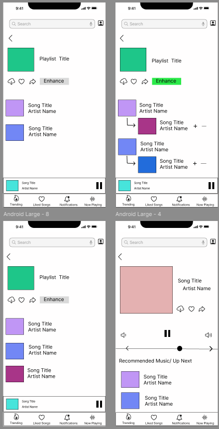 Throughout these prototypes, I found that changing the structure of the playlist to make it more of a drop down menu after you click on the ‘Enhance’ feature. The other screens are added to show a more developed form of how I hope the UI looks like in the future.